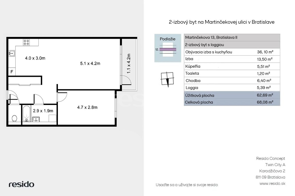 • celková úžitková plocha 68,08 m² (z toho byt 62,69 m² + balkón 5,39 m²)